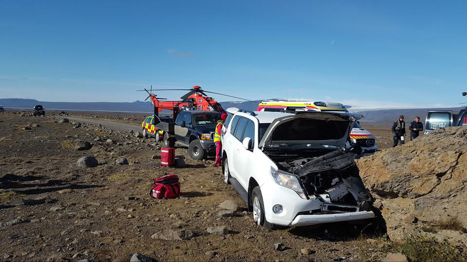 Klukkan 10:20 í morgun barst Brunavörnum Árnessýslu tilkynning um útaf akstur á Kjalvegi. Þrennt var í bílnum, tveir höfðu komist út af sjálfsdáðum en ökumaðurinn var fastur í bílnum og eitthvað slasaður. Bíllinn hafði farið utanvegar og hafnað á stóru grjóti. Um klukkustund eftir að tilkynning barst voru björgunarsveitafólk úr viðbragðsteyminu á Flúðum, slökkviliðsmenn frá Brunavörnum Árnessýslu á Flúðum, lögreglan og sjúkraflutningamenn komin á staðinn, ásamt þyrlu Landhelgisgæslunnar. Menntaðir sjúkraflutningamenn sem starfa hjá Mountaineers of Iceland við Skálpanes komu einnig á staðinn.