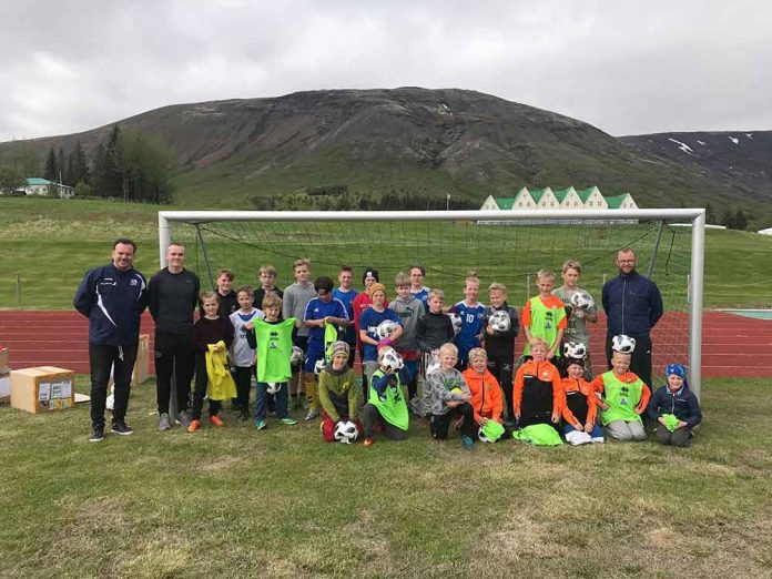 Knattspyrnan er í mikilli uppsveiflu á þessum stöðum og tengist m.a. ferðaþjónustu en þrír mjög áhugasamir strákar þjálfa hópana. Um þessar mundir eru um 70 krakkar að æfa hjá þeim. Tómas spurði krakkana hvort þau vissu hvað KSÍ væri og ekki stóð á svarinu: „Já, eigandi landsliðsins”. Þau voru einnig spurð um uppáldsleikmenn en það voru þeir Gylfi og Jón Daði.