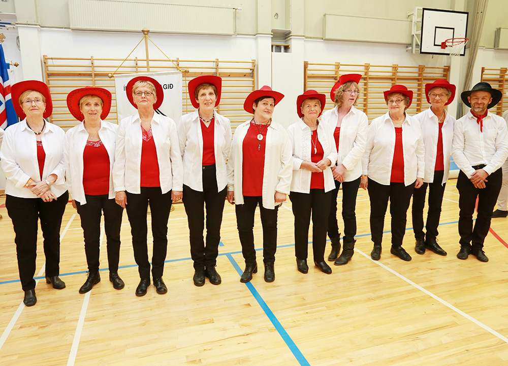 Í kvöld var Landsmót UMFÍ 50+ 2017 sett í íþróttahúsinu í Hveragerði. Við það tækifæri lék Kvartett Vigdísar Ásgeirsdóttur létt sumarlög og fimleikastúlkur úr Hveragerði sýndu listir sínar. Aðal dagskráliður kvöldsins var keppni í línudansi og var hún jöfn og spennandi en tvö lið skiptu með sér þriðja sætinu. Í lok dagskrár flutti Magnús Þór lag sitt Ísland er land þitt við góðar undirtektir. Hægt er að skoða fleiri myndir með því að smella hér.