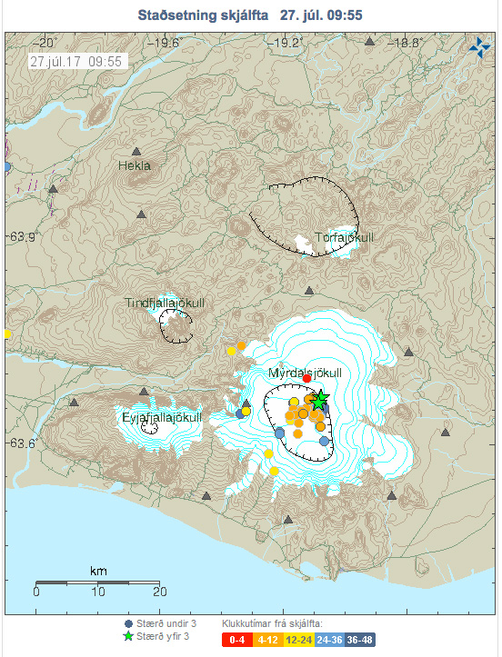 Skjálftarnir hafa fundist víða á Reykjanesi og höfuðborgarsvæðinu. Í gærkvöldi kl. 22:18 varð jarðskjálfti af stærðinni 3,2 kl. 22:15 og annar kl 22:18 4,5 að stærð í Mýrdalsjökli. Skjálfarnir fundust í nærliggjandi sveitum.