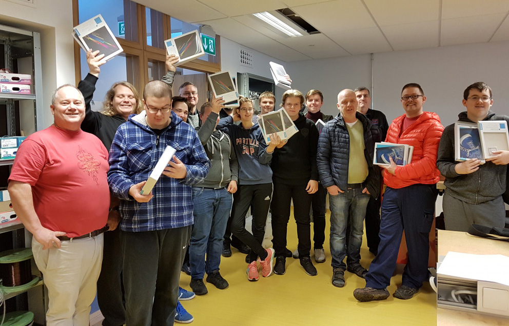 Í liðinni viku komu fulltrúar frá Rafiðnaðarsambandinu og Samtökum rafverktaka á Suðurlandi færandi hendi og gáfu nemendunum 11 sem er á fyrsta ári á grunndeild rafiðna í Fjölbrautaskóla Suðurlands, nýjar glæsilegar spjaldtölvur svo að nemendur geti nýtt Rafbókina, aðalnámsefnið í rafiðnum í námi sínu. Mikil ánægja var meðal nemenda og kennara brautarinnar með þessa glæsilegu gjöf.