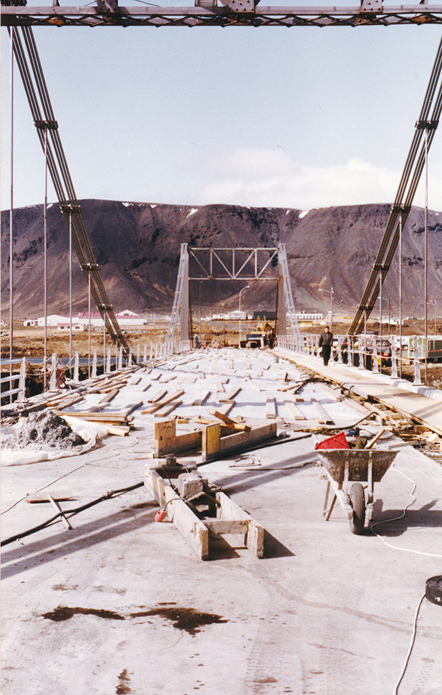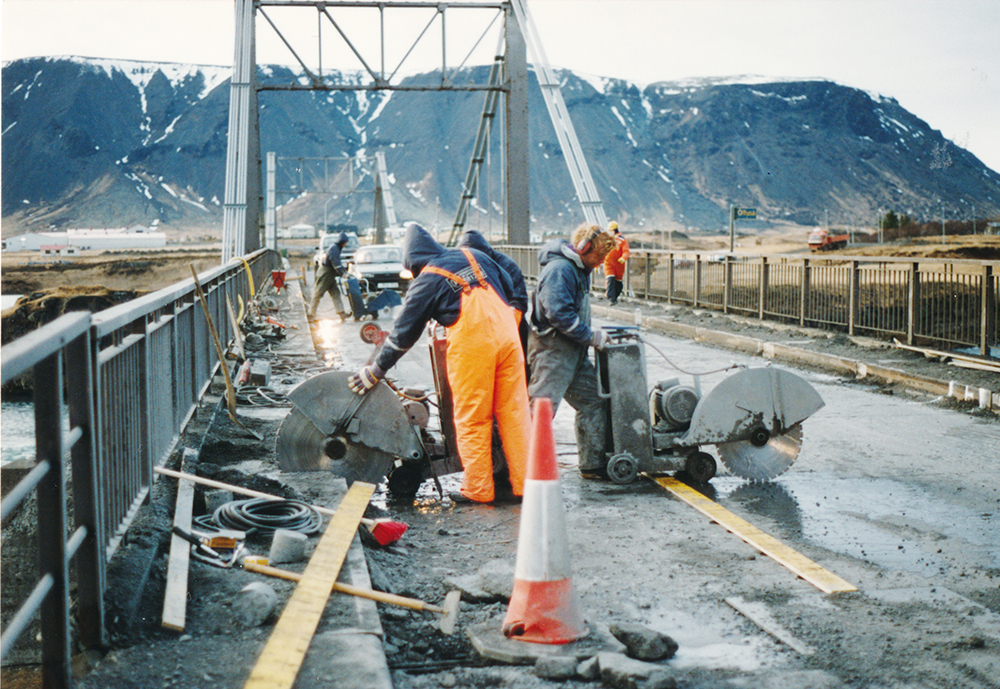 Í gegnum tíðina hefur Ölfusárbrú þurft sitt viðhald. Í safni Dagskrárinnar fundust þessar myndir af steypuvinnu við brúargólfið. Eftir heimildum blaðsins var gólf brúarinnar síðast steypt í maí 1992. Glöggir lesendur geta mögulega áttað sig á hverjir eru á myndunum.