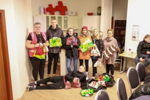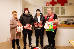 Um 130 krakkar úr níunda- og tíunda bekk Sunnulækjarskóla komu færandi hendi í Rauða krossinn við Eyraveg á Selfossi í morgun. Krakkarnir komu með gjafir sem búið var að pakka inn í poka sem kvenfélagskonur hafa saumað.