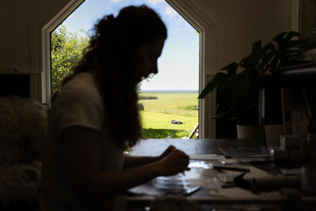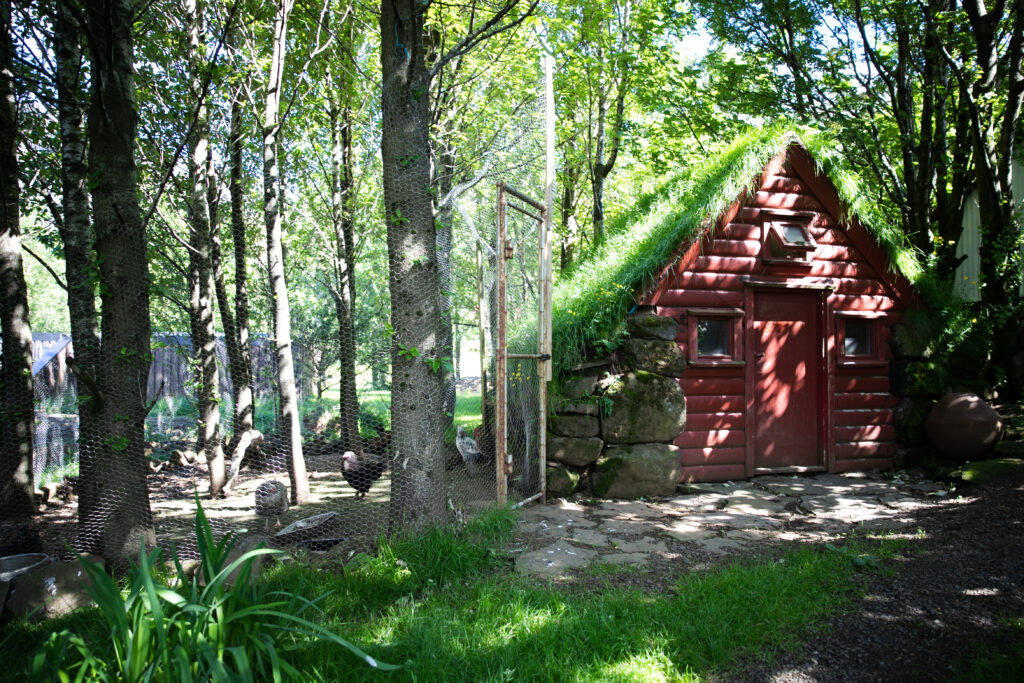 Brosmild Jana leiðir mig í átt að bænum, þaðan sem ég finn ljúfan ilminn af nýbökuðum flatkökum í loftinu. Ég kemst fljótt að því hvaðan lyktin kemur þegar við göngum á bakvið hús en inn um opnar dyr sjáum við Jónu þar sem hún heilsar okkur glaðlega, svuntuklædd með spaða í hönd og bakar flatkökur. Við Jana höldum áfram með Össu vappandi okkur við hlið, röltum framhjá hænsnakofa með fullt af gaggandi hænum inni í hálfgerðum skógi sem leynist í bakgarðinum, áður en við höldum inn að litlu vinnustofunni hennar Jönu.