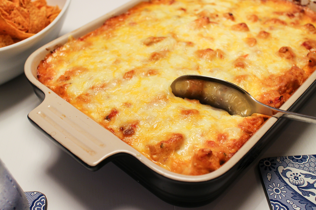 Ofn hitaður i 200 gráður. Kjúklingur og laukur er steiktur á pönnu þar til kjúklingurinn hefur tekið lit, þá er kryddað með hvítlaukskryddi, burritokryddi og salti og pipar ásamt kjúklingakrafti. Því nœst er tómötum í dós og ½ salsa bætt út á pönnuna og leyft að malla í nokkrar mínútur.