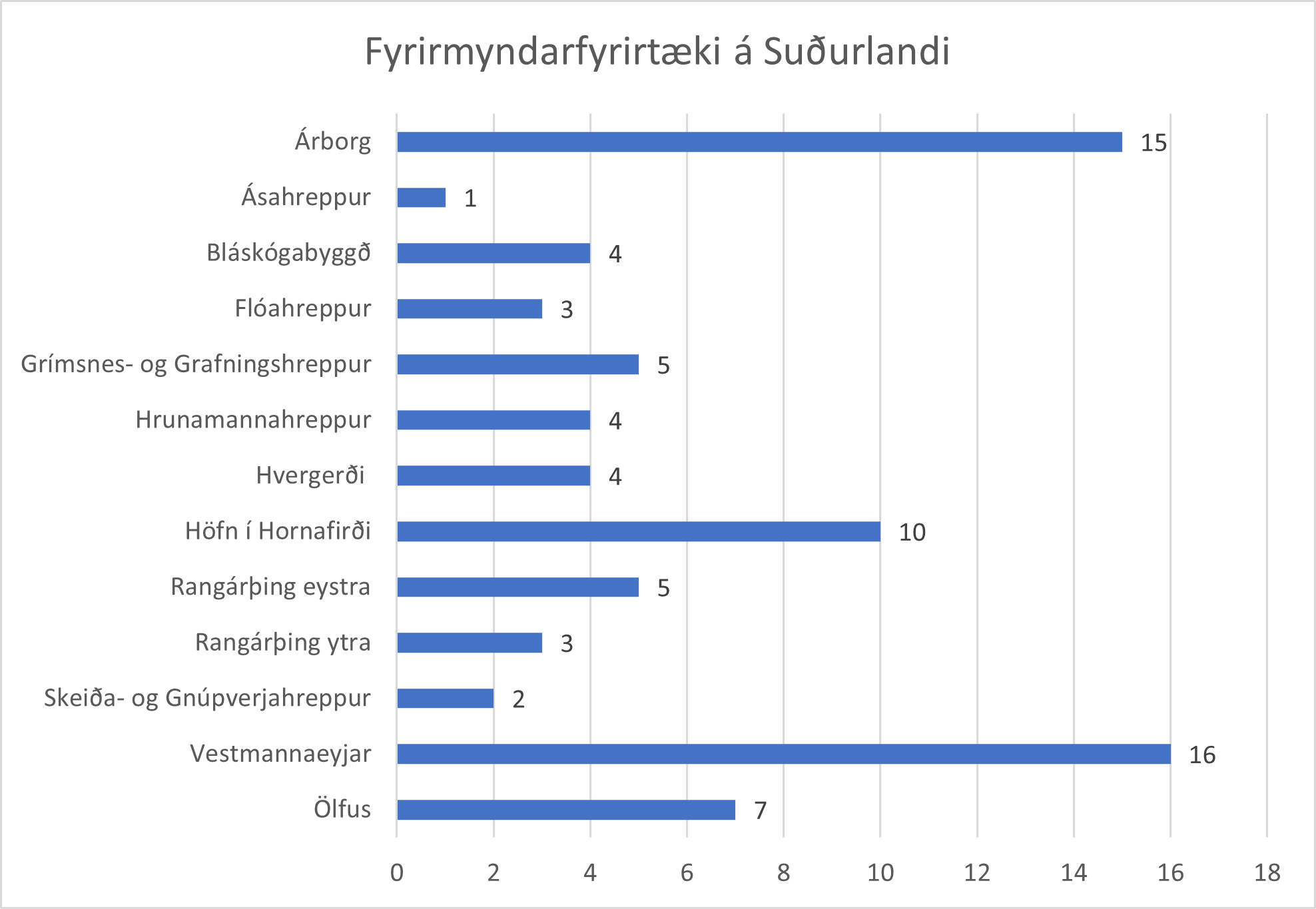 Það er athyglisvert að skoða hvar á Suðurlandi fyrirmyndarfyrirtækin eru skráð og að þessu sinni eru fyrirtæki frá 13 af 15 sveitarfélögum á Suðurlandi á listanum. Mesta fjölgun fyrirtækja á milli ára er á Höfn í Hornafirði en þeim fjölgar um 4 og í Grímsnes- og Grafningshreppi sem fjölgar um 3.
