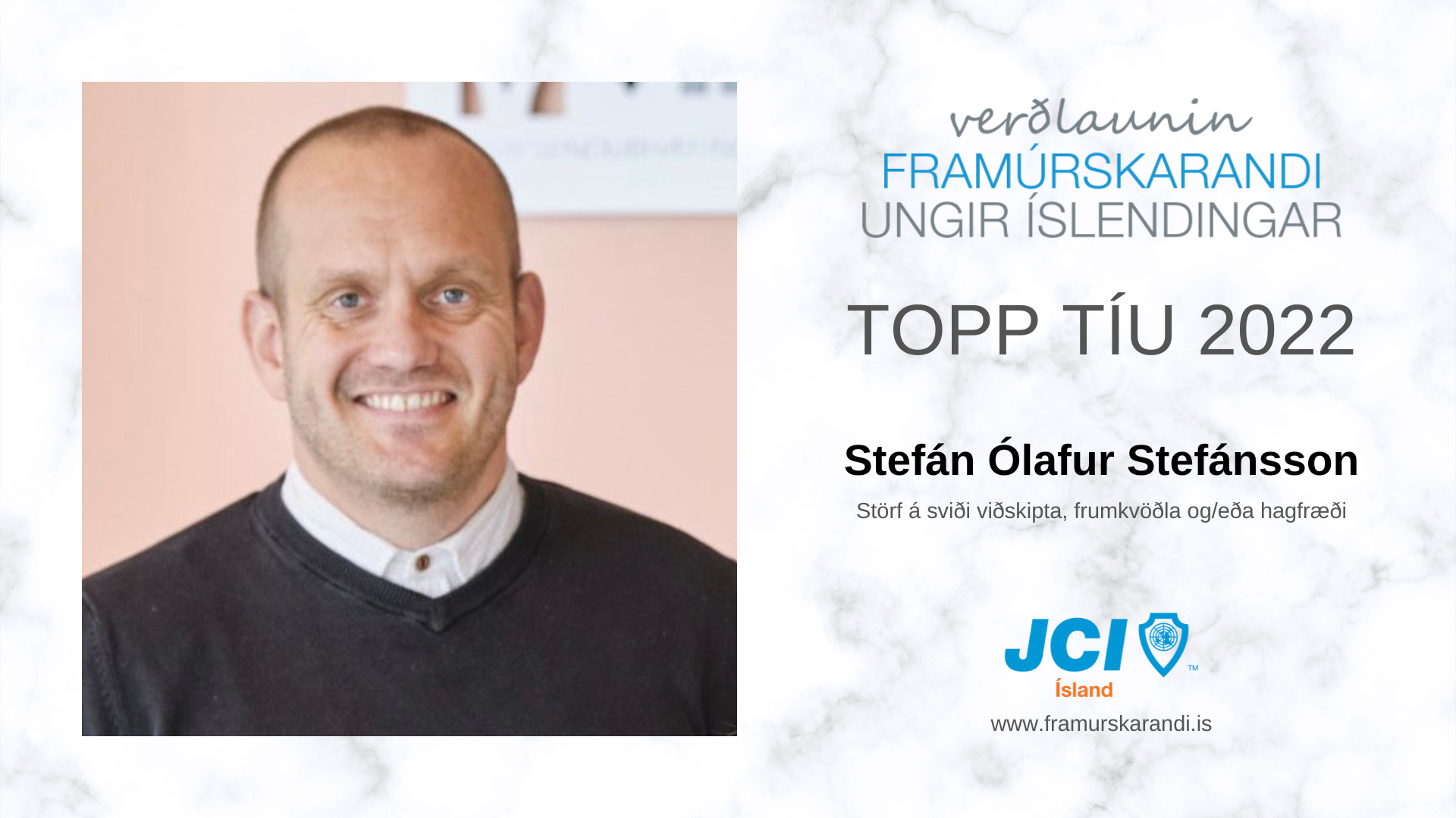 fær viðurkenningu fyrir störf á sviði viðskipta, frumkvöðla og/eða hagfræði. Stefán er tveggja barna fjölskyldufaðir á Seltjarnarnesi, útskrifaður með B.A. í Uppeldis- og menntunarfræði og M.Sc. í Markaðsfræði og Alþjóðaviðskiptum frá Háskóla Íslands. Árið 2016 stofnaði hann ásamt öðrum fyrirtækið Ekki Gefast Upp! með það að markmiði að bjóða upp á líkamsrækt fyrir börn og ungmenni sem glíma við andlega vanlíðan s.s kvíða og þunglyndi. Markmiðið með stofnun Ekki gefast upp! var að skapa jákvæða upplifun af hreyfingu fyrir einstaklinginn og mæta honum með persónulegri nálgun og þéttum stuðningi. Á námskeiðum þeirra er leitast við að skapa tækifæri fyrir börn og ungmenni sem búa að neikvæðri reynslu úr heimi skólaíþrótta eða skipulags íþróttastarfs til að finna aftur þá gleði og ánægju sem hreyfing getur haft. Námskeiðin hafa hlotið mikilla vinsælda síðan þau hófu göngu sína árið 2016 og hafa skapað sér stóran sess í þeim málaflokki er kemur að forvörnum og ræktun geðheilbrigðis meðal barna og ungmenna. Eftirspurnin er mikil og fjölbreyttur hópur einstaklinga sækir þar þjálfun.