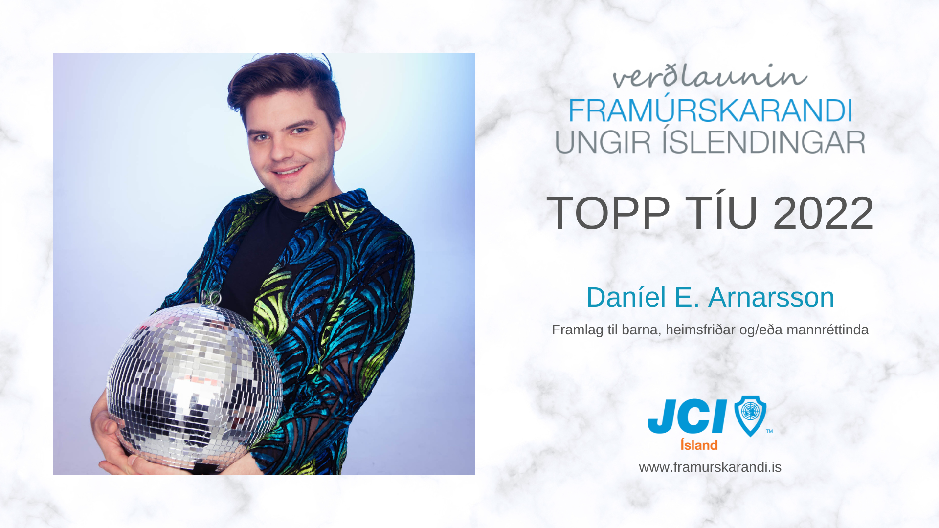 Daníel E. Arnarson úr Þorlákshöfn og Stefán Ólafur Stefánsson frá Öxnalæk eru meðal þeirra tíu ungu Íslendinga sem hlotið hafa viðurkenningar fyrir að vera Framúrskarandi ungur Íslendingur 2022 af þessum tíu einstaklingum verður svo valinn einn verðlaunahafi. Verðlaunin hafa verið veitt árlega af JCI á Íslandi frá árinu 2002 og verða því veitt í 21. skipti í dag, miðvikudaginn 30. nóvember þegar Forseti Íslands, Guðni Th. Jóhannesson afhendirverðlaunin ásamt landsforseta JCI.