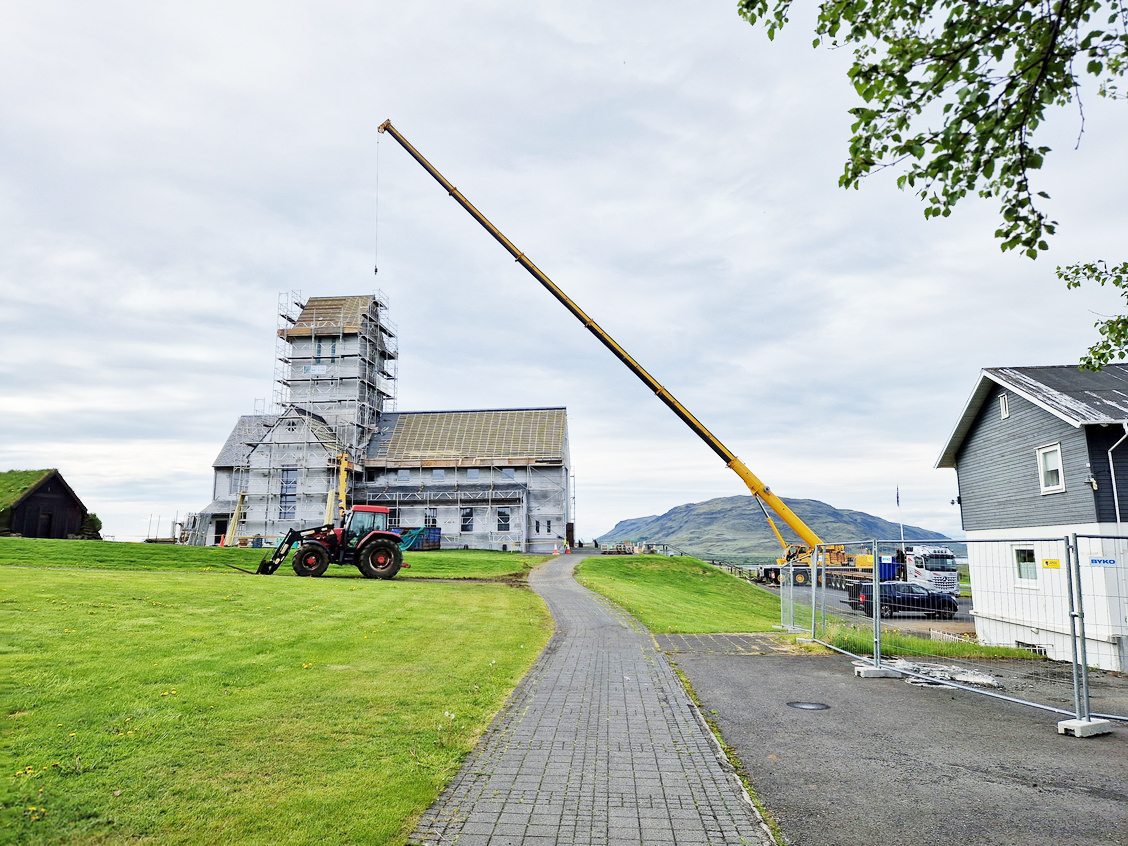 Söguleg stund átti sér stað í Skálholti þegar ný, dönsk kirkjuklukka var hífð upp í kirkjuturn Skálholtskirkju, en sú gamla hafði brotnað 20 árum áður.