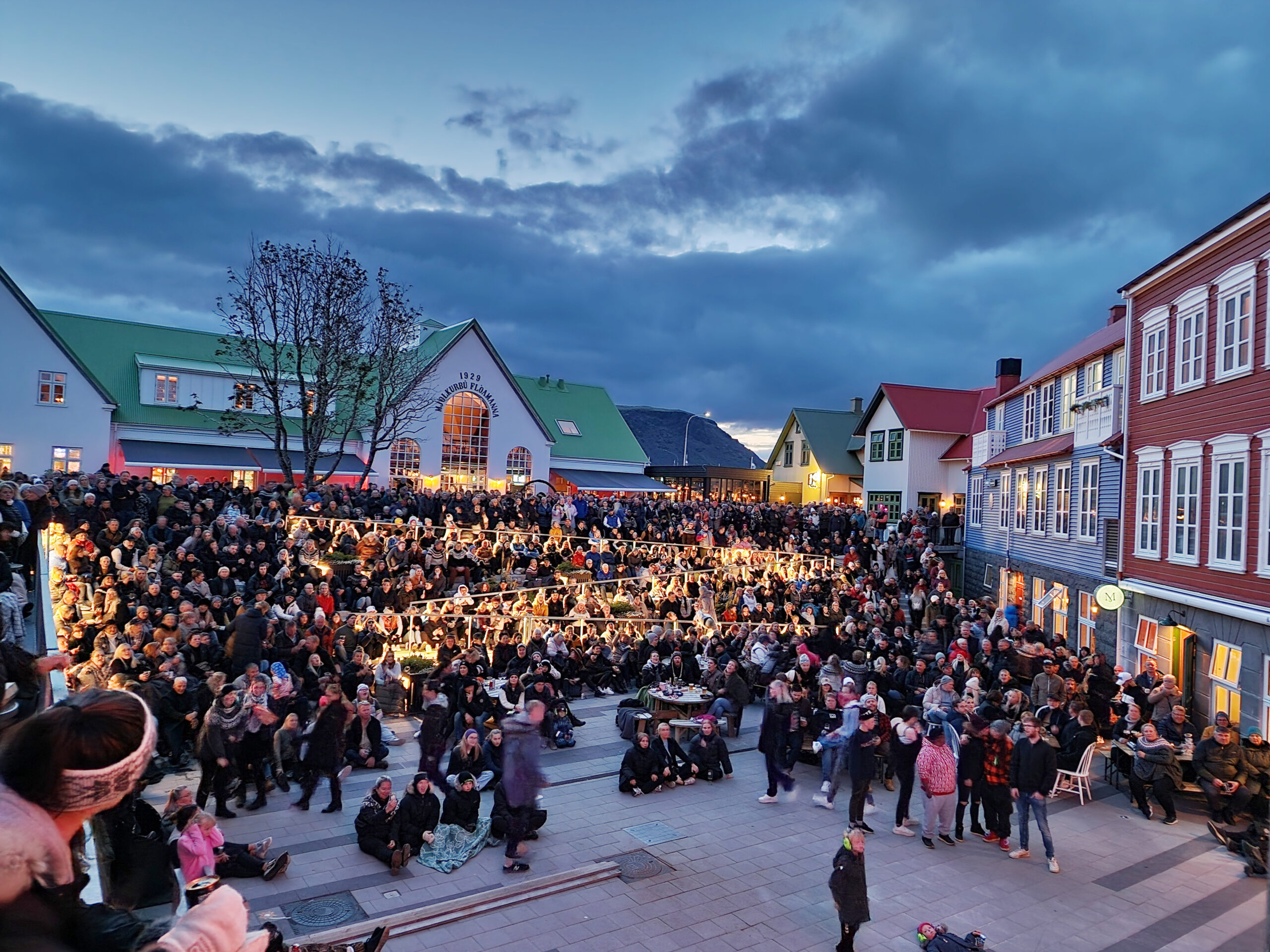 Brekkusöngnum frá Þjóðhátíð í Vestmannaeyjum var varpað á stórt tjald á Brúartorgi í miðbæ Selfoss á aðfaranótt frídags verslunarmanna. Fjöldi fólks safnaðist þar saman og naut þess að hlusta og syngja með.