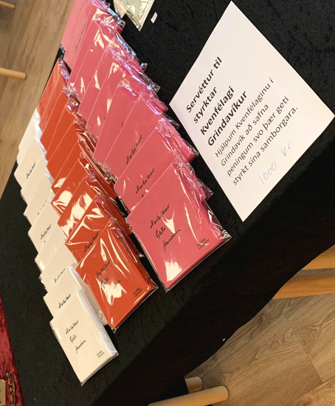 „Nú hugsa ég: „Ooo.. Af hverju tók ég ekki þetta og þetta…“ sem við öll erum örugglega búin að upplifa. En svona er þetta bara,“ Segir Solla og yppir öxlum. „Við sáum blessunarlega engar skemmdir eða sprungur á húsinu okkar á þeim fáu mínútum sem við fengum að fara heim og rafmagn og hiti hafði ekki farið af. Fyrstu dagarnir í skipulaginu gengu mjög brösuglega, hringt var í suma dag eftir dag og aðra ekkert. Fólki var gefinn tími en þurfti að bíða í röð í 5-6 klukkutíma eftir því að komast inn í bæinn í fylgd með björgunarsveitafólki. En þeim hefur eitthvað tekist að skipuleggja þetta betur og í dag er fólk að fá að komast inn í bæinn á þeim tímum sem þeim eru gefnir skilst mér. Þann stutta tíma sem ég fékk að fara heim til að sækja einhverjar eigur tók ég nýjustu söluvöru kvenfélags Grindavíkur, dagbækurnar sem við í Kvenfélaginu erum að selja og óseldar servíettur. Á þær eru gildi félagsins prentuð með handskrift Birnu Óladóttur fyrrum formanns og heiðursfélaga. Kærleikur, Gleði, Samvinna. Ég verð að sega að hann Erling Sigurðsson, offsetprentari sem hefur prentað á servíetturnar fyrir okkur, er alveg magnaður maður. Hann er rúmlega sjötugur og er búin að bjarga okkur alveg! Hann prentaði á 400 servéttur sem við notuðum á bleikum fundi okkar í október, hann gerði nokkra pakka sem við ákváðum að prófa að selja og allt seldist upp. Við fegnum margar pantanir og nú prentar hann á hvítar,bleikar og rauðar fyrir okkur. Ekki nóg með að hann prenti á servétturnar, þá á ég erfitt með að fá að borga honum fyrir vinnuna hans. Nokkur félög hafa haft samband og vilja kaupa og selja servétturnar fyrir okkur til aðstoðar fyrir okkar fjáröflunin. Kvenfélag Bústaðarsóknar var með basar síðustu helgi og var salan með ólíkindum og erum við þeim afar þakklátar fyrir aðstoðina,“ bætir Solla við.