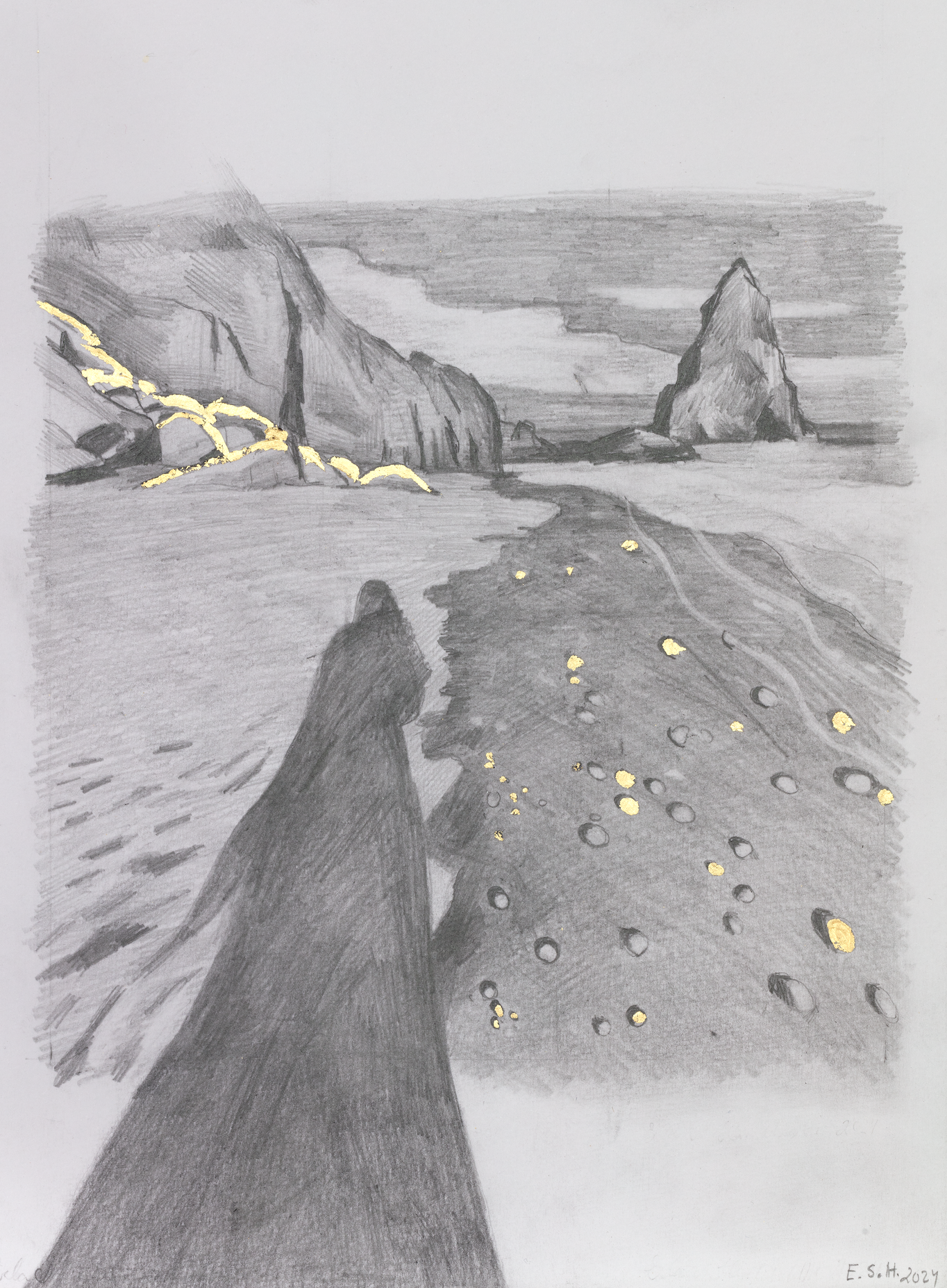 Erla S. Haraldsdóttir sýnir gvassverk auk blýantsteikninga með blaðgulli og málaða skúlptúra úr náttúruefnum og eru verkin unnin á árabilinu 2021 til 2024.