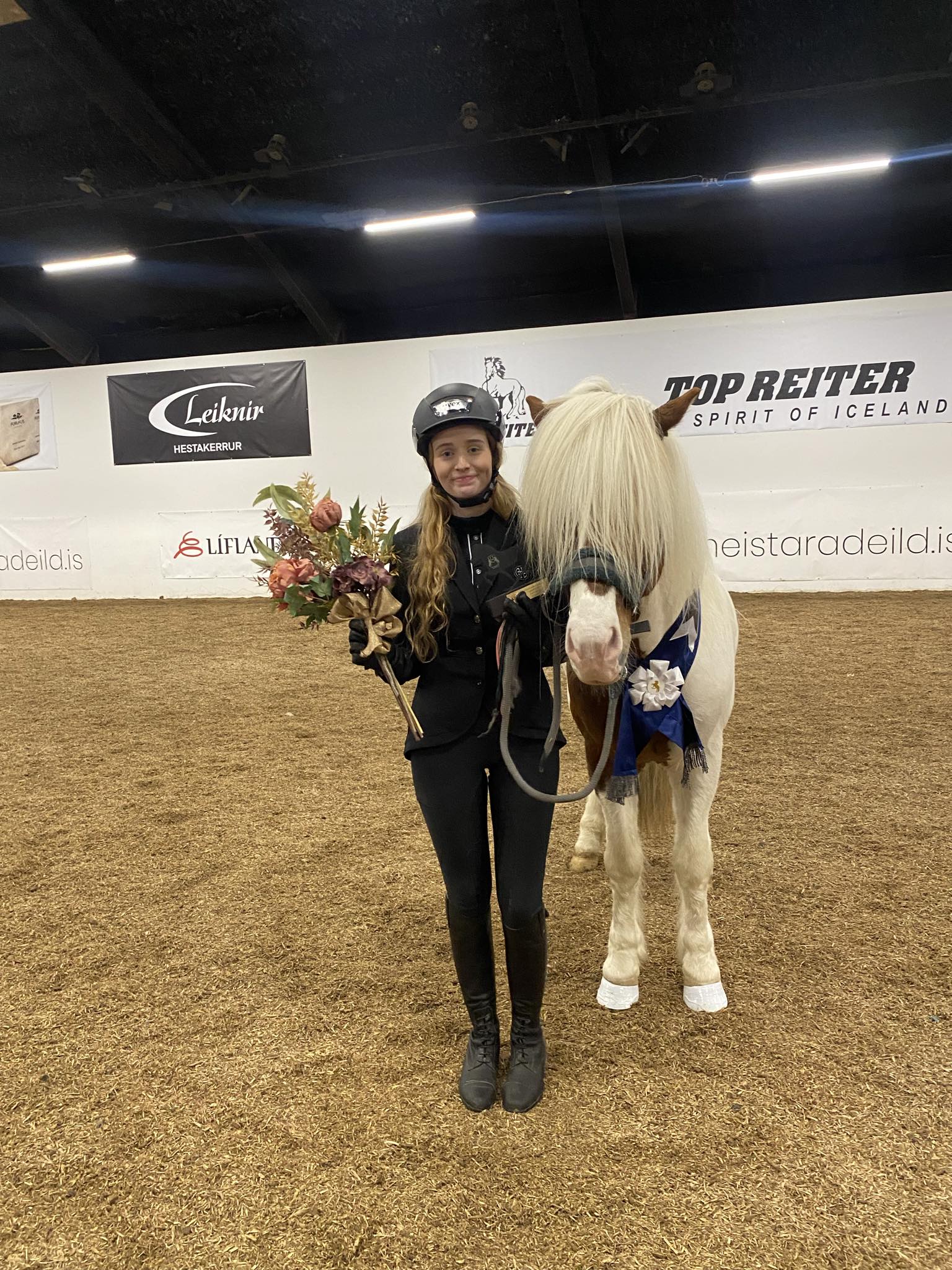 Védís Huld keppti á hestinum Ísak frá Þjórsárbakka en þau stóðu efst eftir forkeppni með 7,43 í einkunn og sigruðu þau æsispennandi úrslitin með 7,94 í aðaleinkunn.