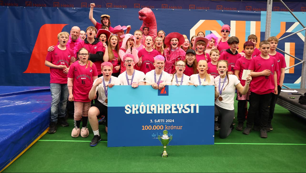 Úrslitakeppni Skólahreystis fór fram í Laugardalshöll sl. laugardag, þar sem Flóaskóli og Laugalækjarskóli luku keppni með jafn mörg stig, 57,5 af 72 mögulegum.