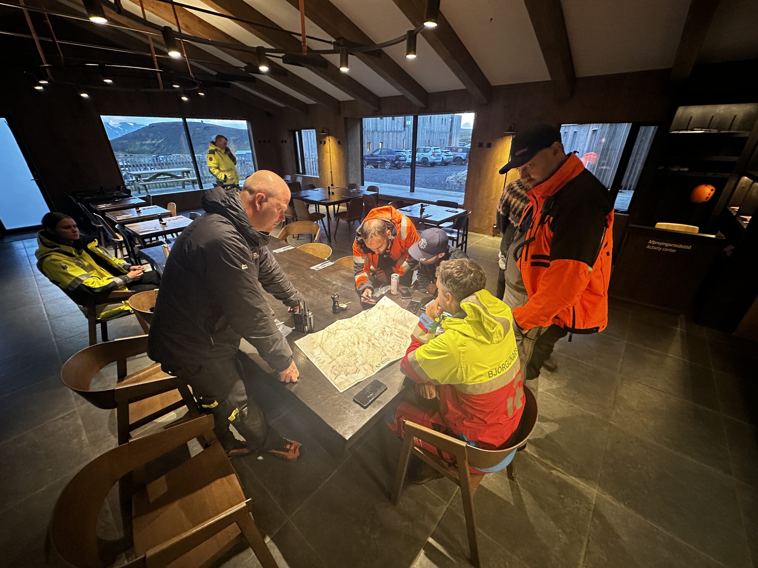 Björgunarfólk hefur leitað vel á og í kringum þá staðsetningu sem fylgdi boðunum í gær. Þar hefur enn ekkert fundist. Gengið er út frá því að fólkið sé í helli, og verið er að þræða alla þekkta hella á svæðinu.