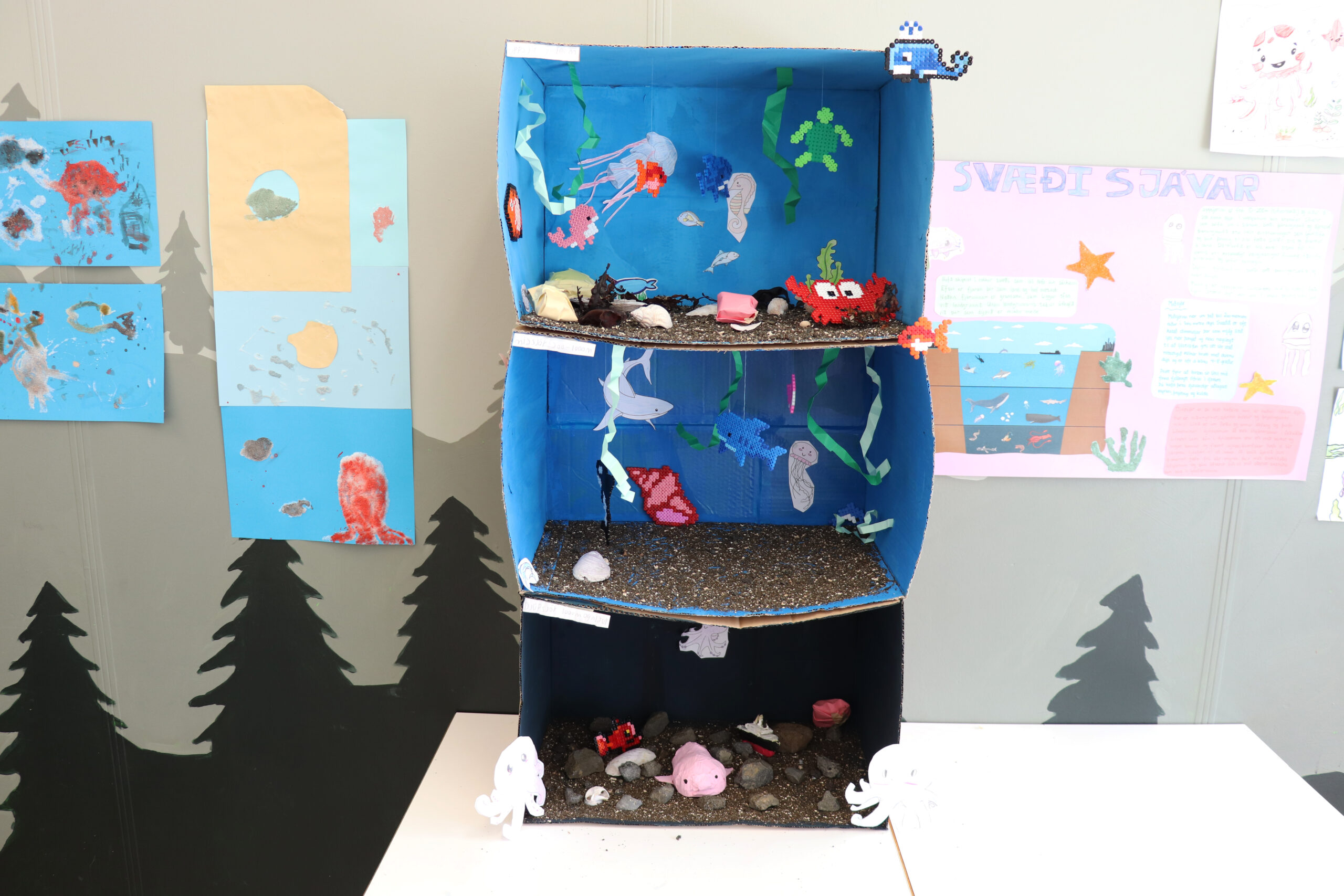 Fyrstu tveir dagarnir fara í vinnu þar sem unnið er að mismunandi sýningum sem var svo opin gestum í dag. „Þetta voru í rauninni bara fjórar klukkustundir sem krakkarnir unnu í þessu verkefni þannig að það er alveg magnað að sjá uppskeruna á þessum stutta tíma,“ segir Tinna. Auk vinnunnar var uppbrot báða daga þar sem krakkarnir fóru í ljósabolta fyrsta daginn og náttúrubingó þann seinni.