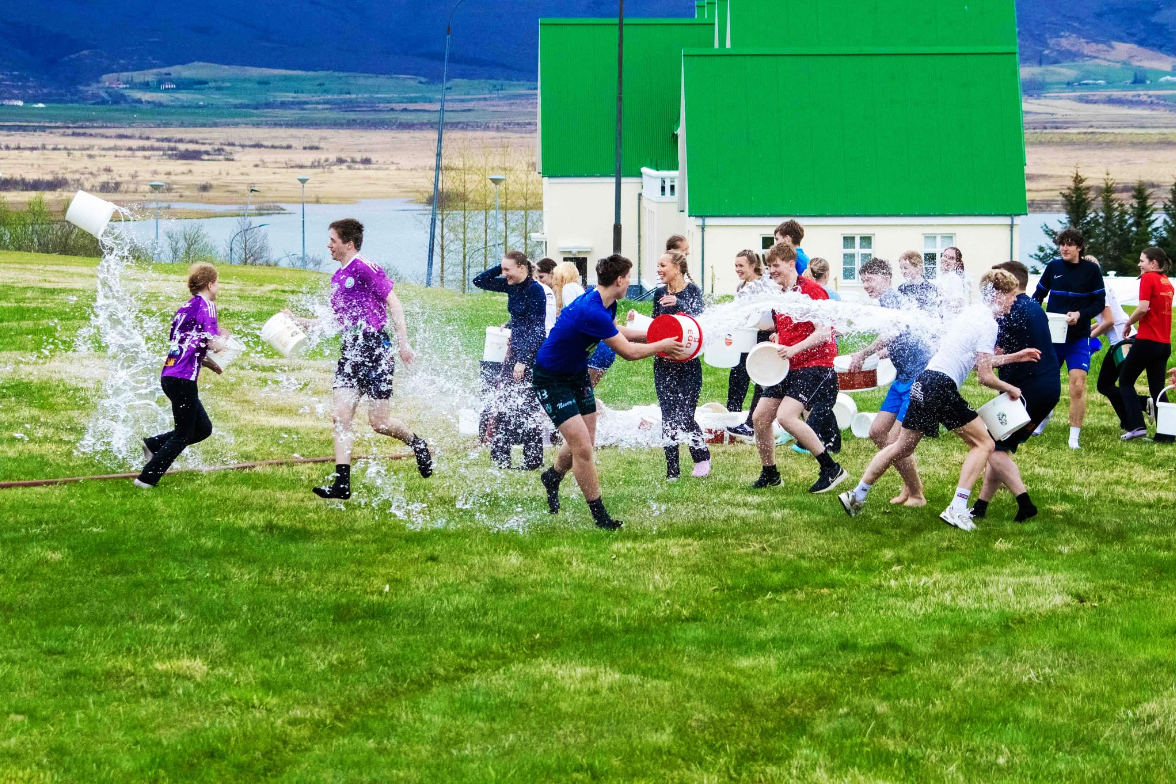Nemendur í Menntaskólanum á Laugarvatni gerðu sér glaðan dag 6. maí sl. þegar haldinn var vatnsslagur á skólalóðinni. Vatnsslagurinn er árleg hefð sem haldin er í miðri lokaprófsviku og er hugsaður til þess að brjóta upp álagið og minnka stress meðal nemenda. Einnig er svipaður viðburður haldinn í desember á námsmatstíma en þá er snjóslagur. Vatnsslöngur og fötur voru dregnar fram og mikil kátína ríkti þegar nemendur tóku þátt í leiknum. Það var svo gaman að það mátti einnig sjá einn eða tvo heimamenn með í leiknum. Þegar fór að leiða að lokum vatnslagsins ákváðu sumir nemendur að ganga skrefinu lengra og hlaupa niður að Laugarvatni og stökkva beinustu leið út í vatnið.