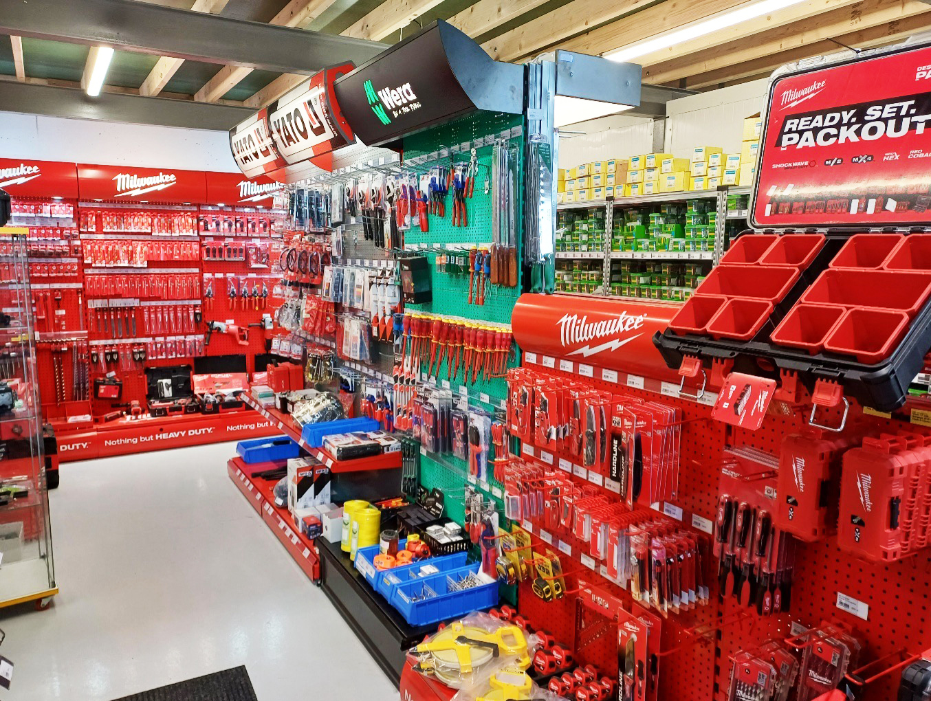 Í Búðinni er að finna fjölbreytt úrval af skrúfum og festingum frá Ferró Zink, fatnaði og öryggisbúnaði, verkfærum frá Verkfærasölunni og Redder – þar á meðal garðyrkjuverkfærum – og frá maí bættist við vörulína frá Garðheimum með mold, áburði, fræjum og fleiru. Þá má finna pípulagningavörur frá Vatnsvirkjanum og Barka, raflagnaefni frá Reykjafelli, olíu og hreinsivörur frá Kemi, ritföng og barnavörur frá A4, málningaverkfæri og sérpantanir frá Málningu, gæludýrafóður frá Petmark, veiðivörur frá Veiðihúsinu, skóvörur frá Skómeistaranum og ýmis öryggistæki frá Eldvarnarmiðstöðinni.