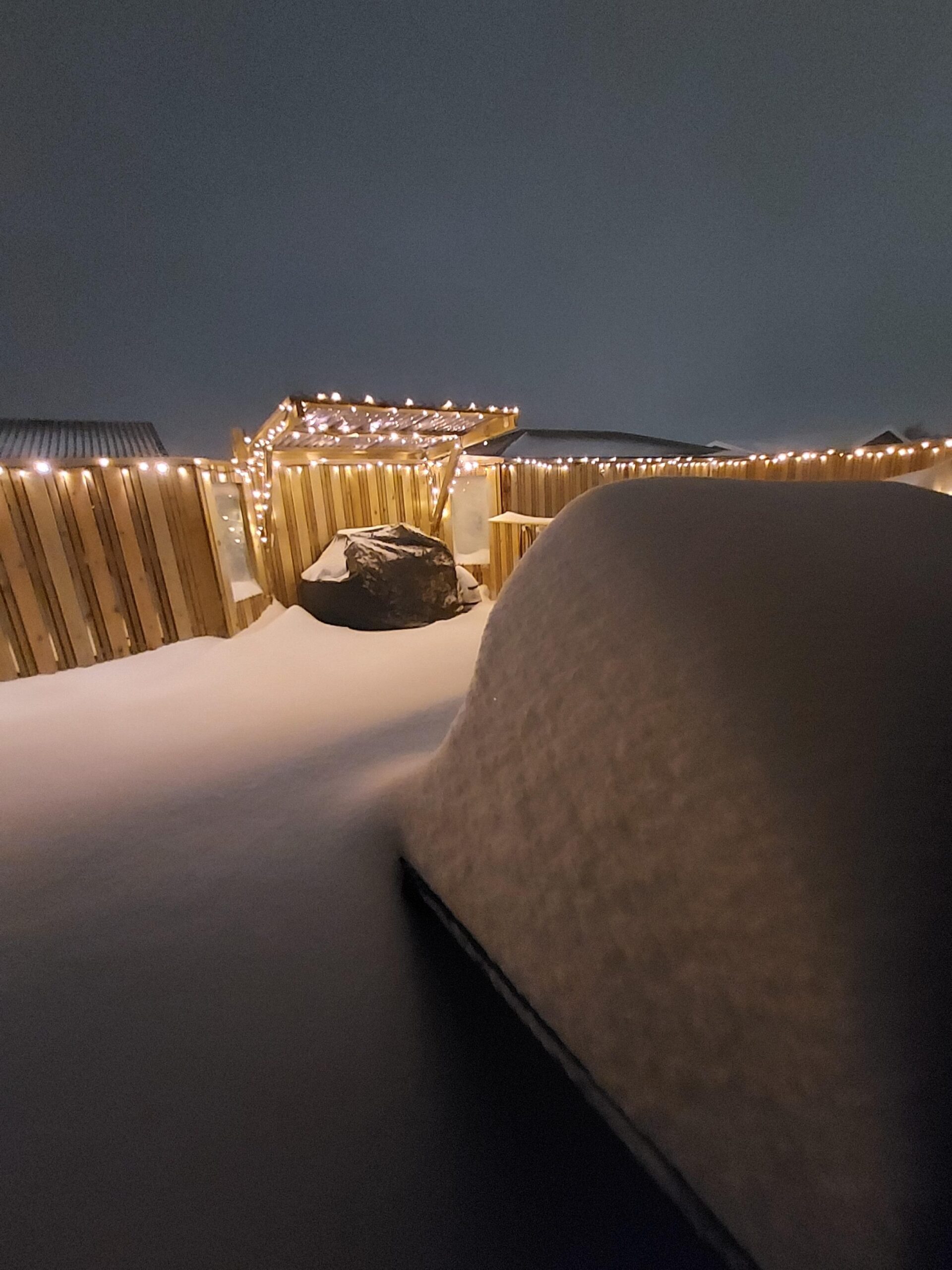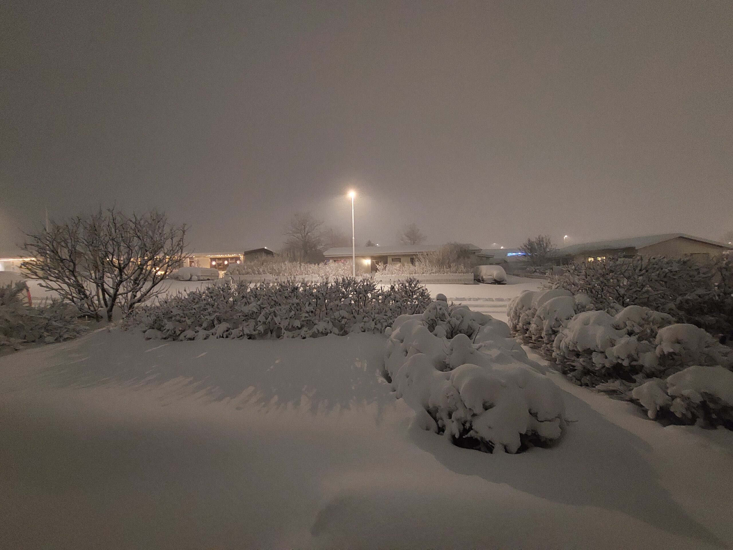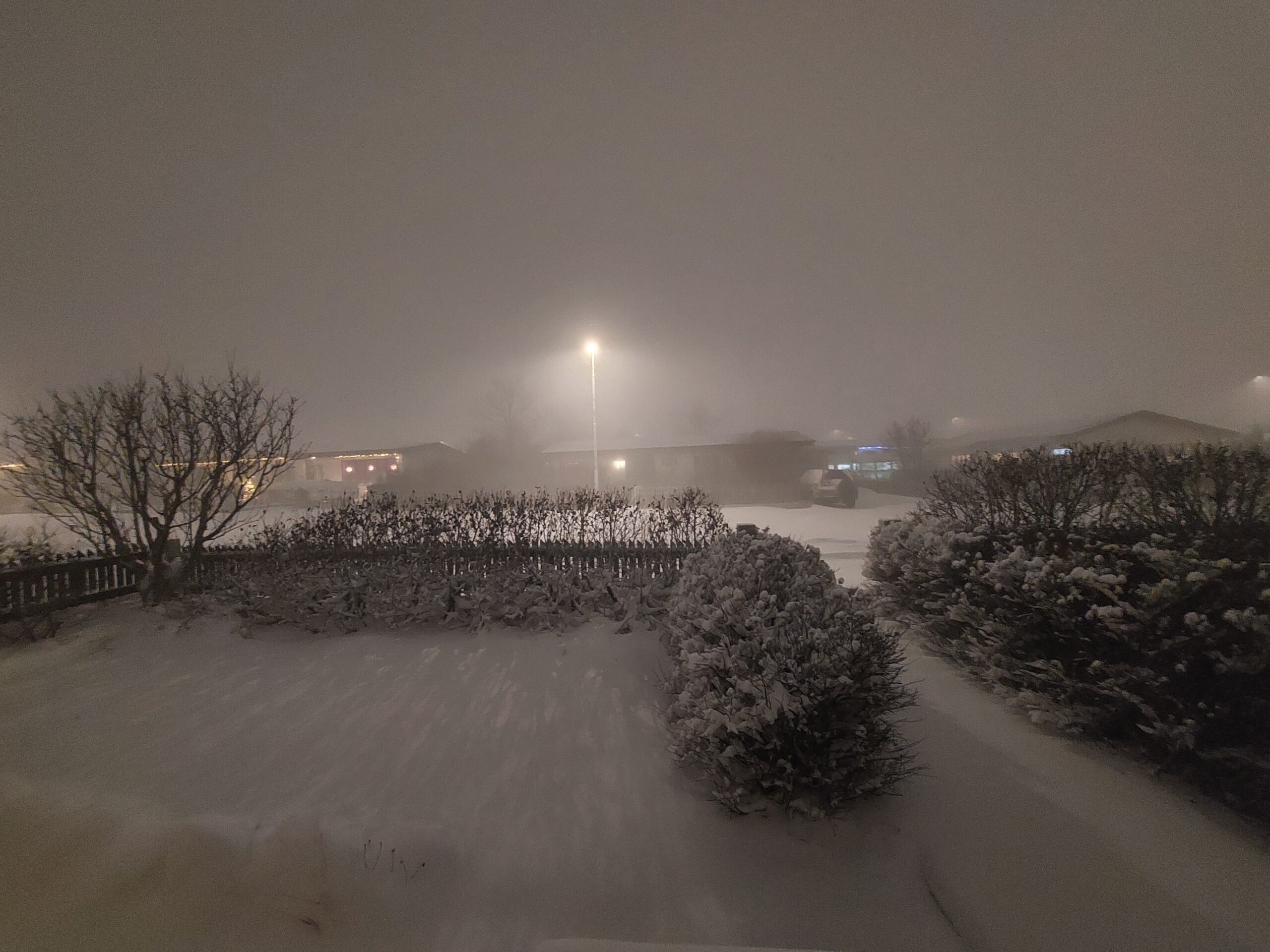 Snjórinn fellur í Þorlákshöfn. Þessi mynd var tekin kl 23:00 á föstudagskvöld. Mynd: Harpa Vignisdóttir.