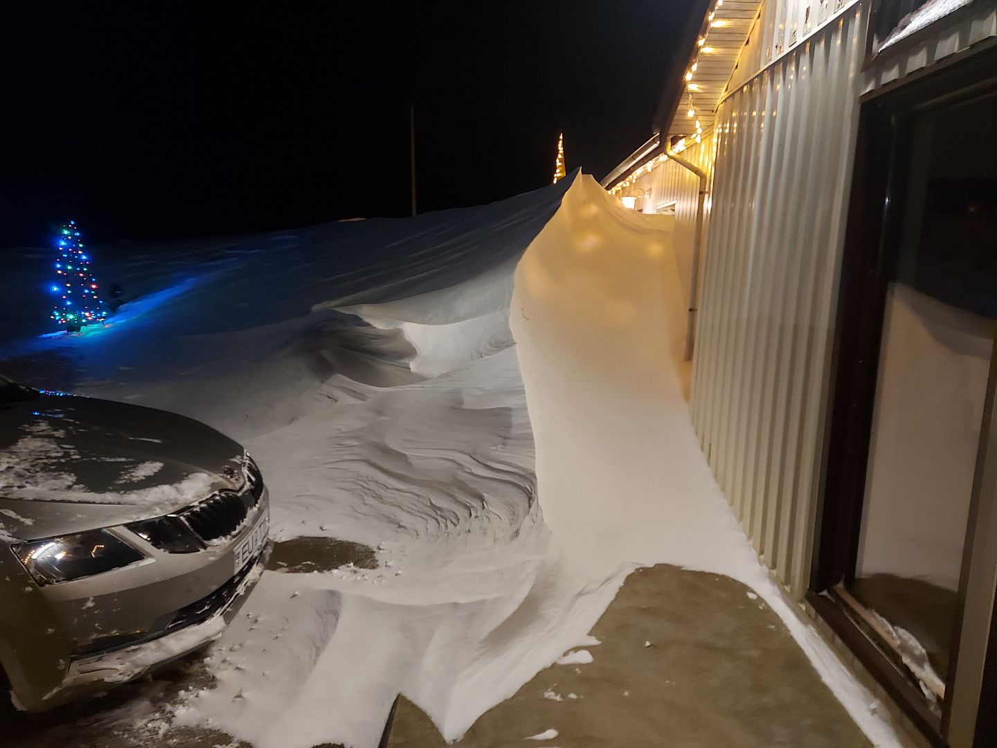 Magnús Baldursson og Bryndís Eva Óskarsdóttir í Dalbæ í Flóa eru ýmsu vön, en hafa ekki lent í því áður að vera algjörlega snjóuð inni. Þurfti fjölskyldan öll að príla út um svefnherbergisglugga að baka til í húsinu þar sem snjó hafði skafið svo hressilega fyrir báðar útidyrnar sem sést glitta í toppinn á. Mynd: Magnús Baldursson