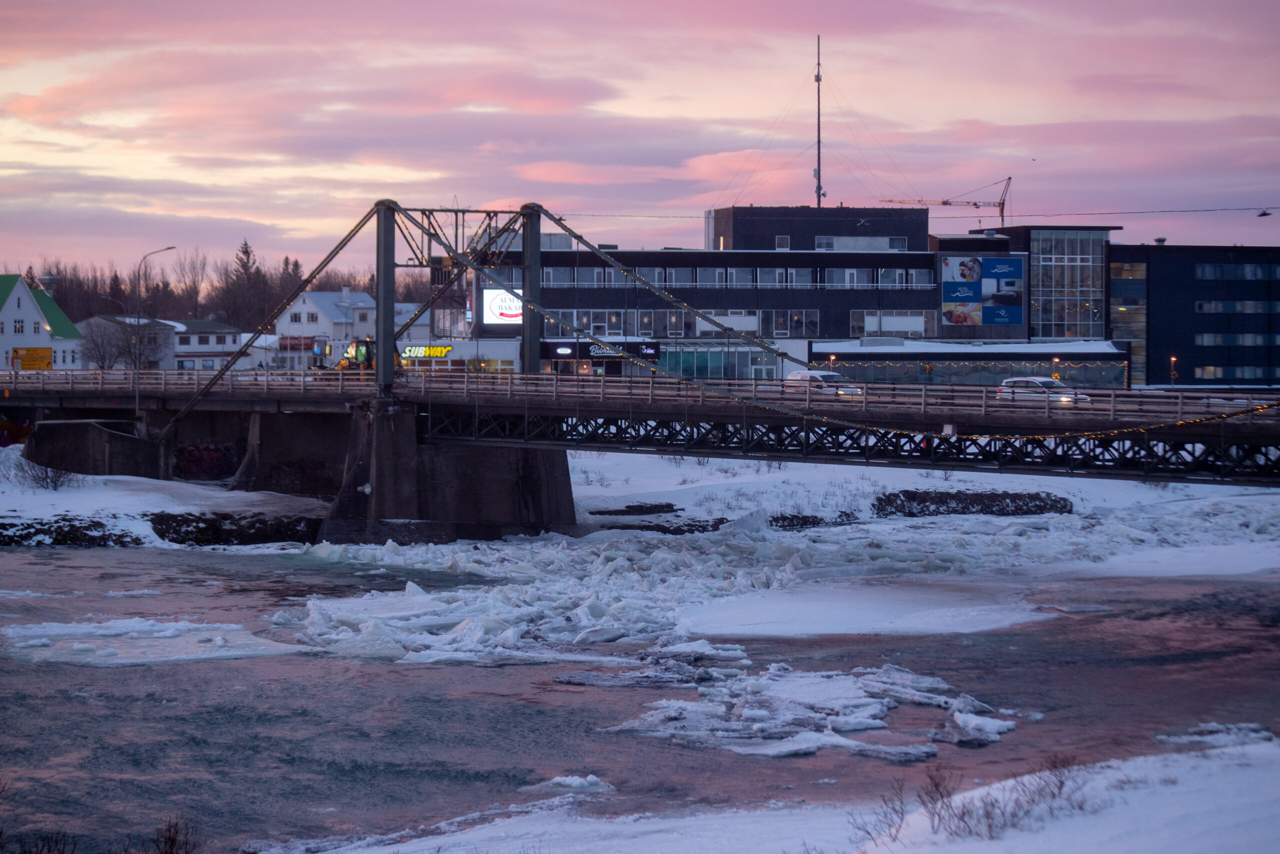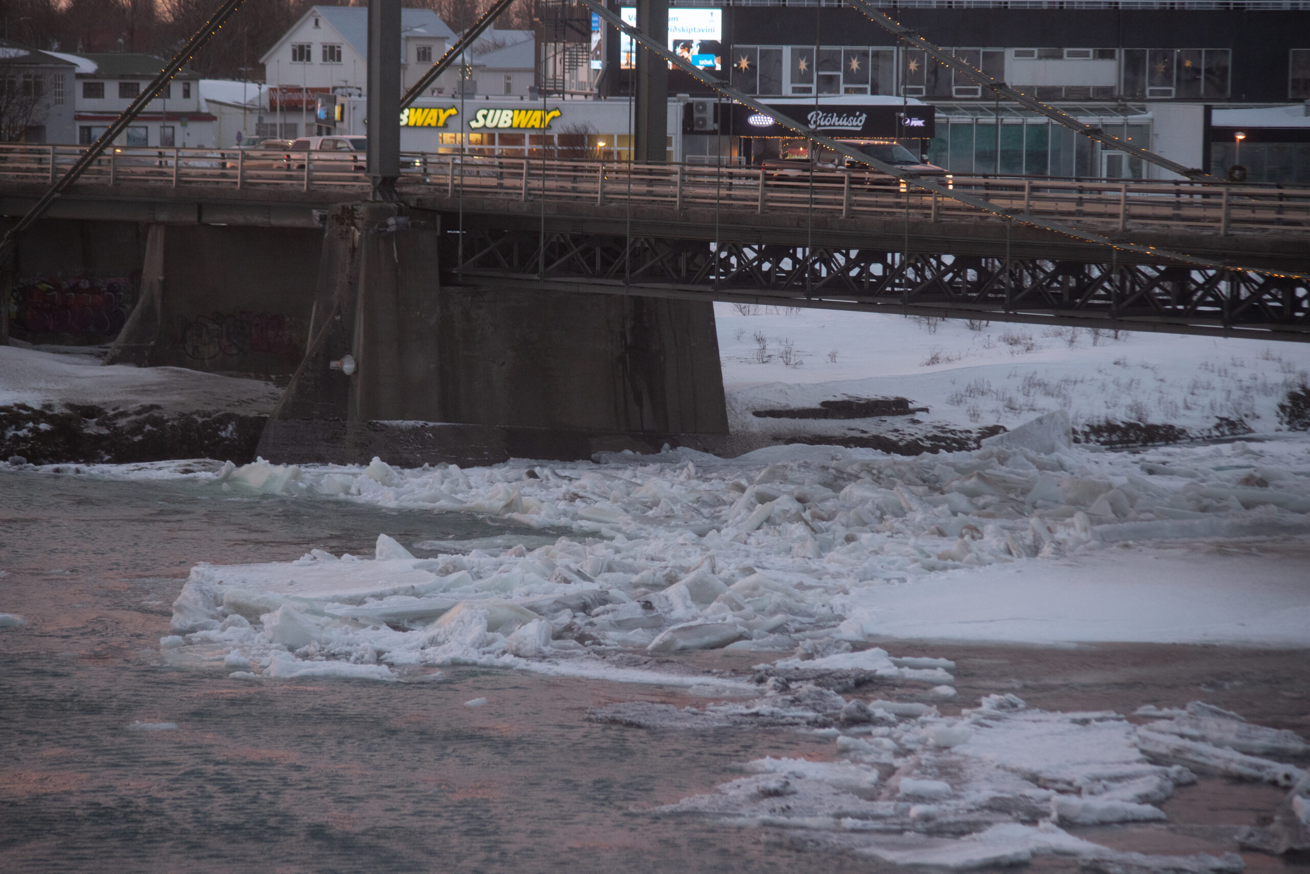 Nú í morgun bárust Dagskránni upplýsingar um að klakastífla væri tekin að myndast í Ölfusá. Vilja svona stíflur gjarnan myndast þegar hlýnar í veðri eftir mikið frost en ekkert útlit er fyrir áframhaldandi hlýnun, heldur á hitinn að lækka með vikunni og stefnir í allt að 18 stiga fost á stöku stað á Suðurlandi um helgina svo ólíklegt hlýtur að teljast að stíflan komi til með að stækka mikið. Blaðamaður brá sér á stjá og tók meðfylgjandi myndir.