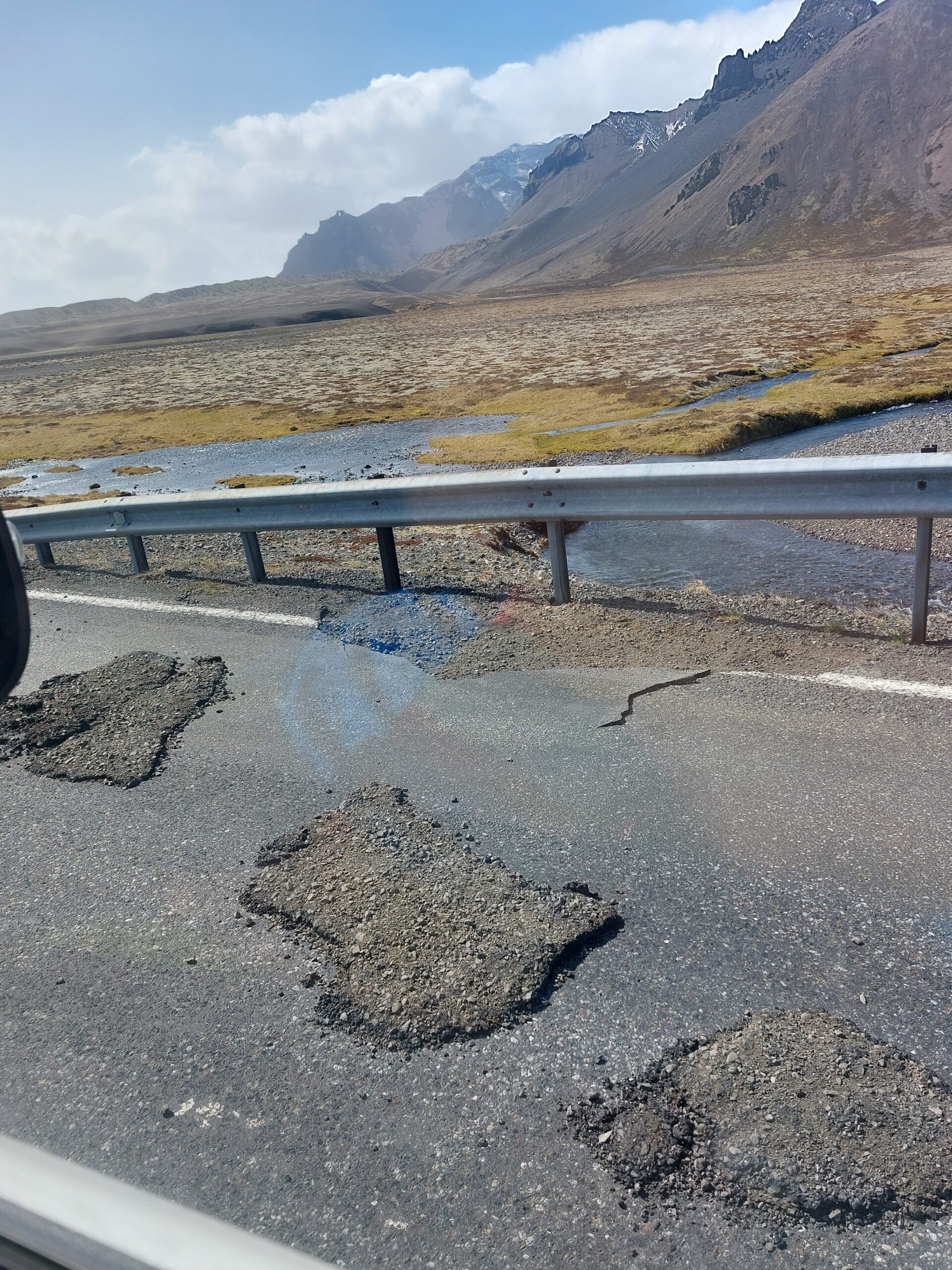 Í tilkynningu frá Landsbjörgu segir að sérstaklega hvasst hafi verið við Fjallsárlón, þar sem varla var stætt. Ferðafólk var almennt í vandræðum og var þjóðveginum lokað frá Skaftafelli að vestan og Jökulsárlóni að austan, á meðan mesta hvassviðrið gekk yfir, en auk bílanna sem fuku út af veginum fauk hluti yfirlags vegarins upp og liggur á hvolfi eins og sjá má á meðfylgjandi mynd.