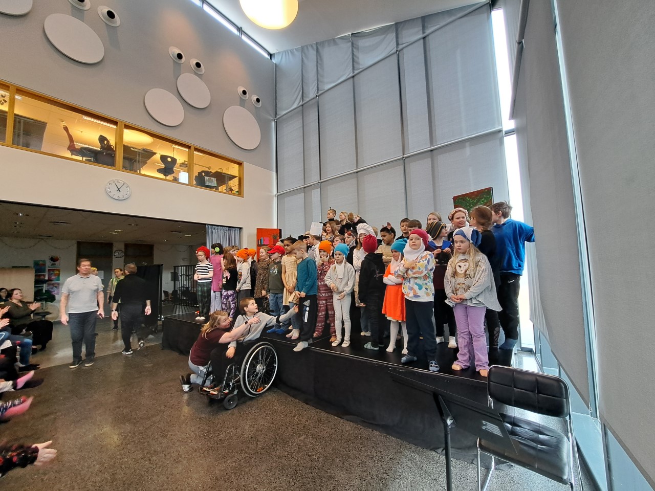 Föstudaginn 31. mars var svo komið að 1. -6. bekk, þau hafa á undanförnum vikum verið að æfa leikrit sem er samsett úr þekktum ævintýrum og leikritum.  Þarna stigu á svið ræningjar, prinsessur, bakarar, mýs, refur, úlfur, veiðimaður, dvergar, stelpur og strákar, tannpínupúkar og margir aðrir.  Þessi leiksýning rann fumlaust áfram eins í atvinnuleikhúsi og skemmtu áhorfendur sér vel en forráðamönnum var boðið að koma og horfa á.  Daginn áður hafði verið forsýning þar sem unglingastigið og elstu nemendur leikskólans mættu og skemmtu sér vel. Þegar leiksýningu var lokið söfnuðust allir saman og snæddu hátíðarhádegisverð í sal skólans.