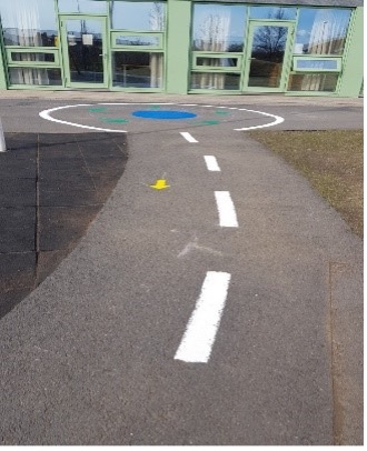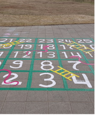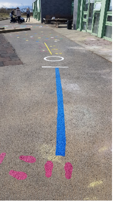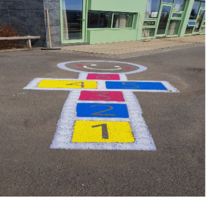 Ásamt hreyfihringnum voru ýmsar þrautir málaðar á stéttina sem ýta undir leikgleði og fjölbreytta hreyfingu.