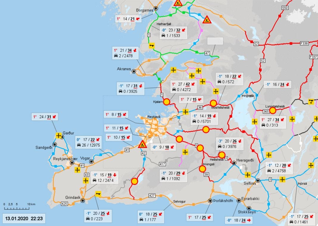Líkur eru á að vegir verði lokaðir fram á morgundag ef marka má færslu Lögreglunnar á Suðurlandi. „Lögreglan vill koma því á framfæri við gististaði í umdæminu að á morgun munu að öllum líkindum fjölmargir vegir verða lokaðir á Suðurlandi. Því er nauðsynlegt að gististaðir kynni gestum sínum sem hyggja á ferðalög í fyrramálið að vegir kunni að vera lokaðir og því ekki hægt að fara um svæðið.“